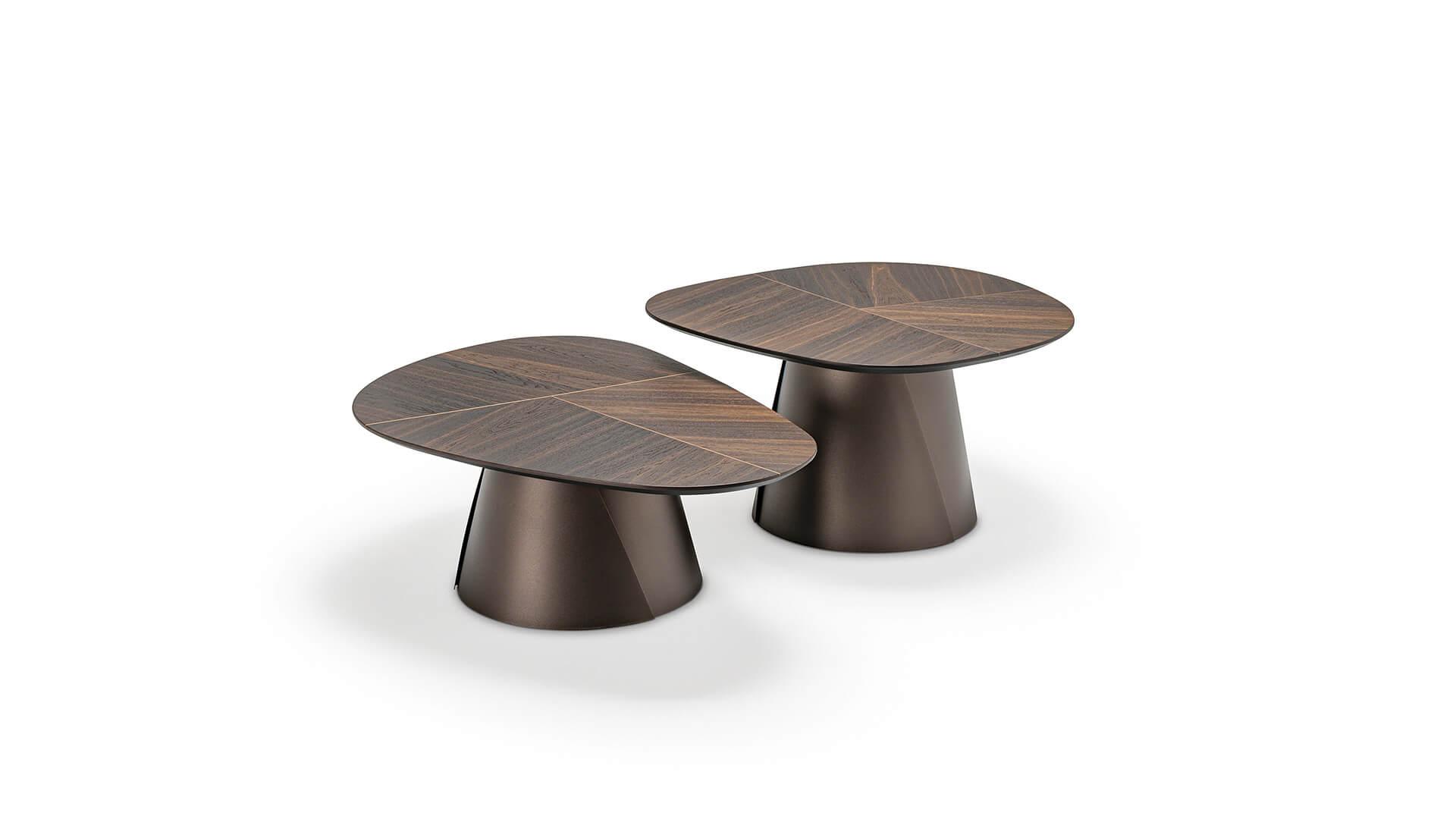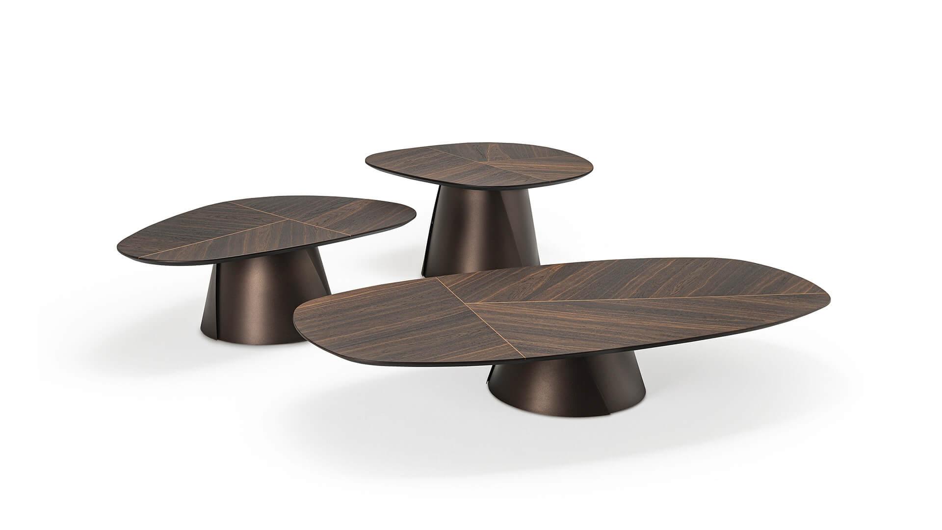 Особенность всей коллекции — деревянная столешница, которая является центральным элементом композиции. Её изготавливают по технологии сбалансированного стыкования древесины с контрастной инкрустацией, что подчёркивает геометрию изделия. Тщательная проработка формы и высокое качество исполнения делают эти дизайнерские деревянные столики настоящим произведением мебельного искусства.