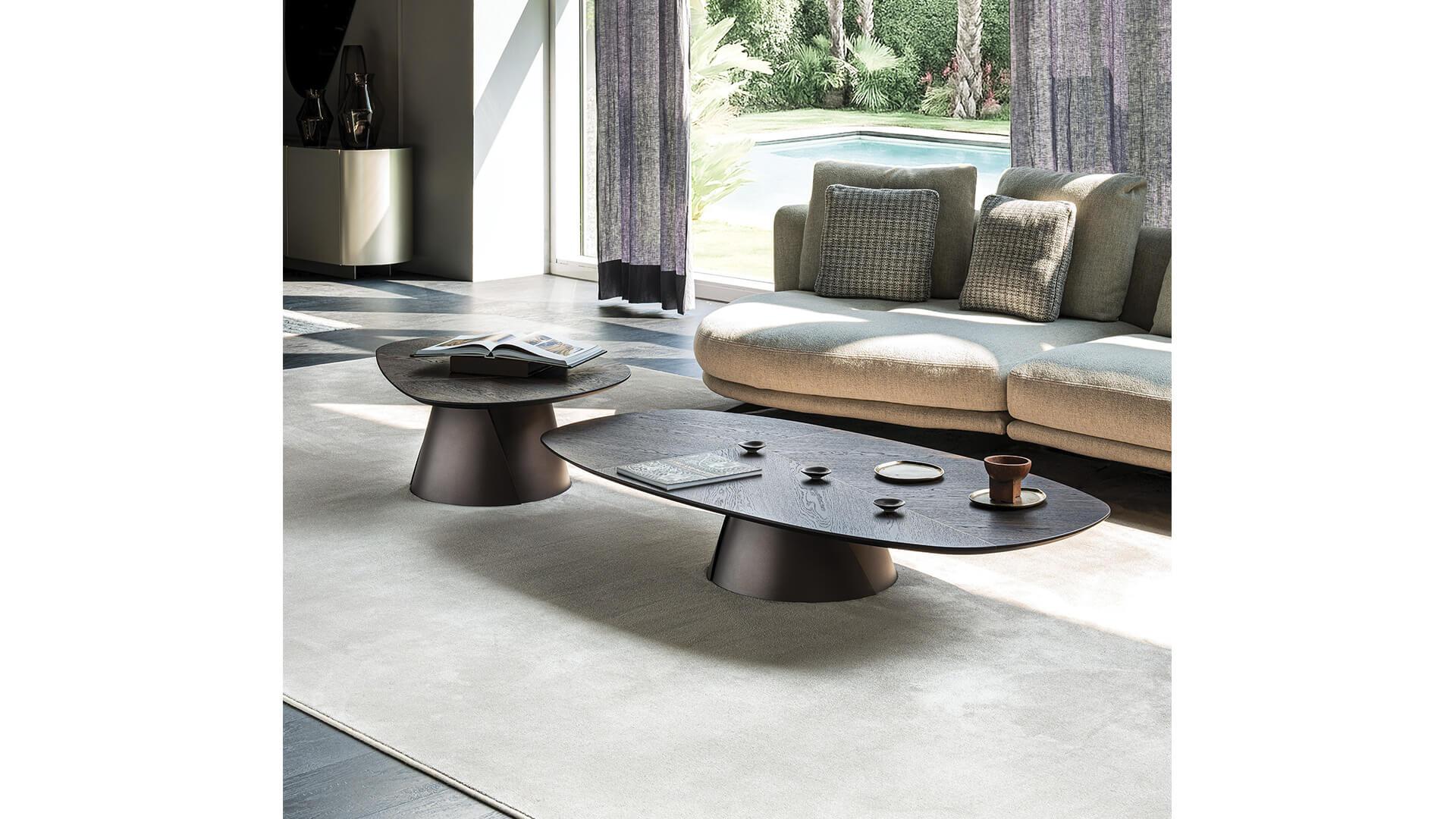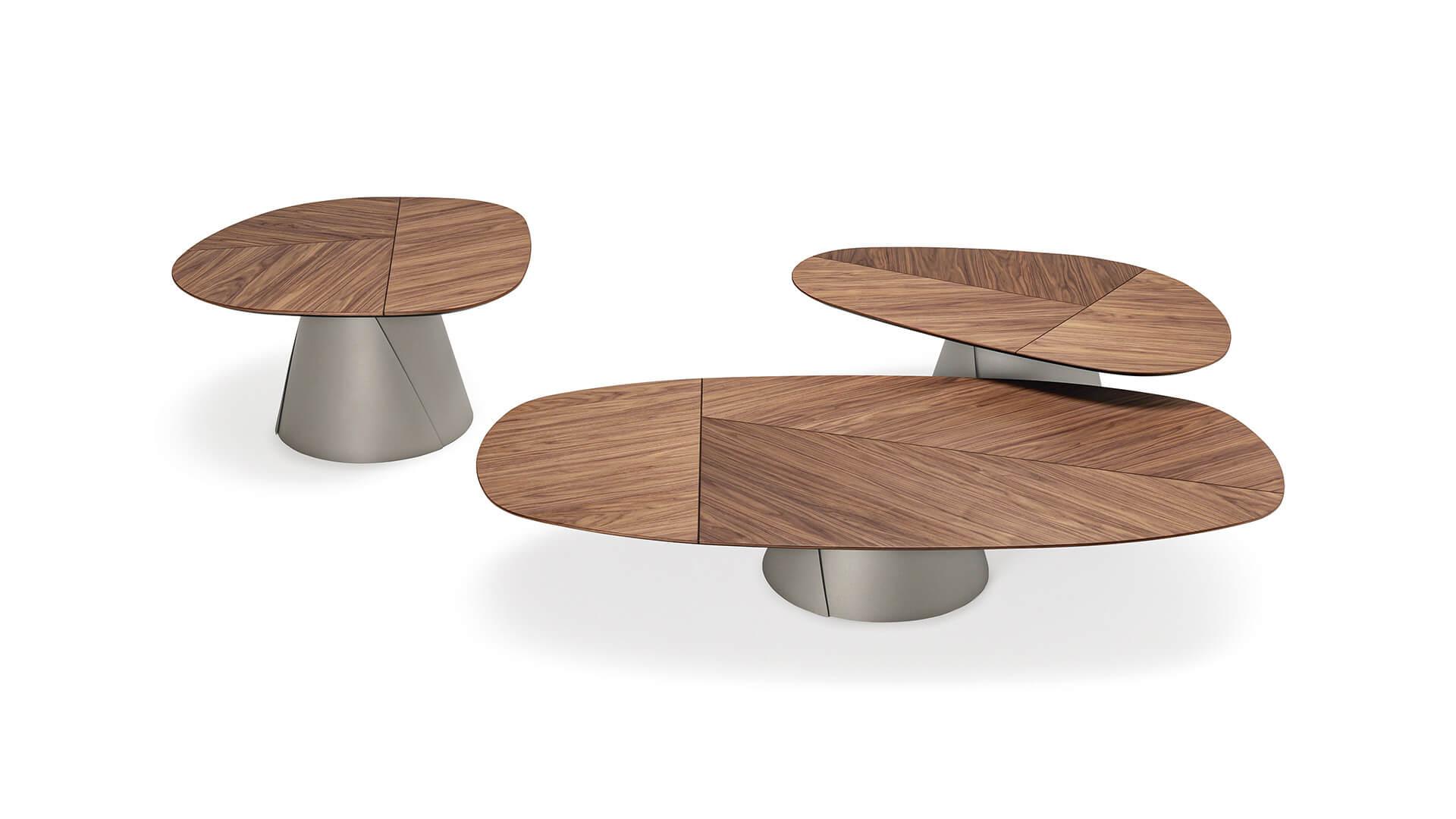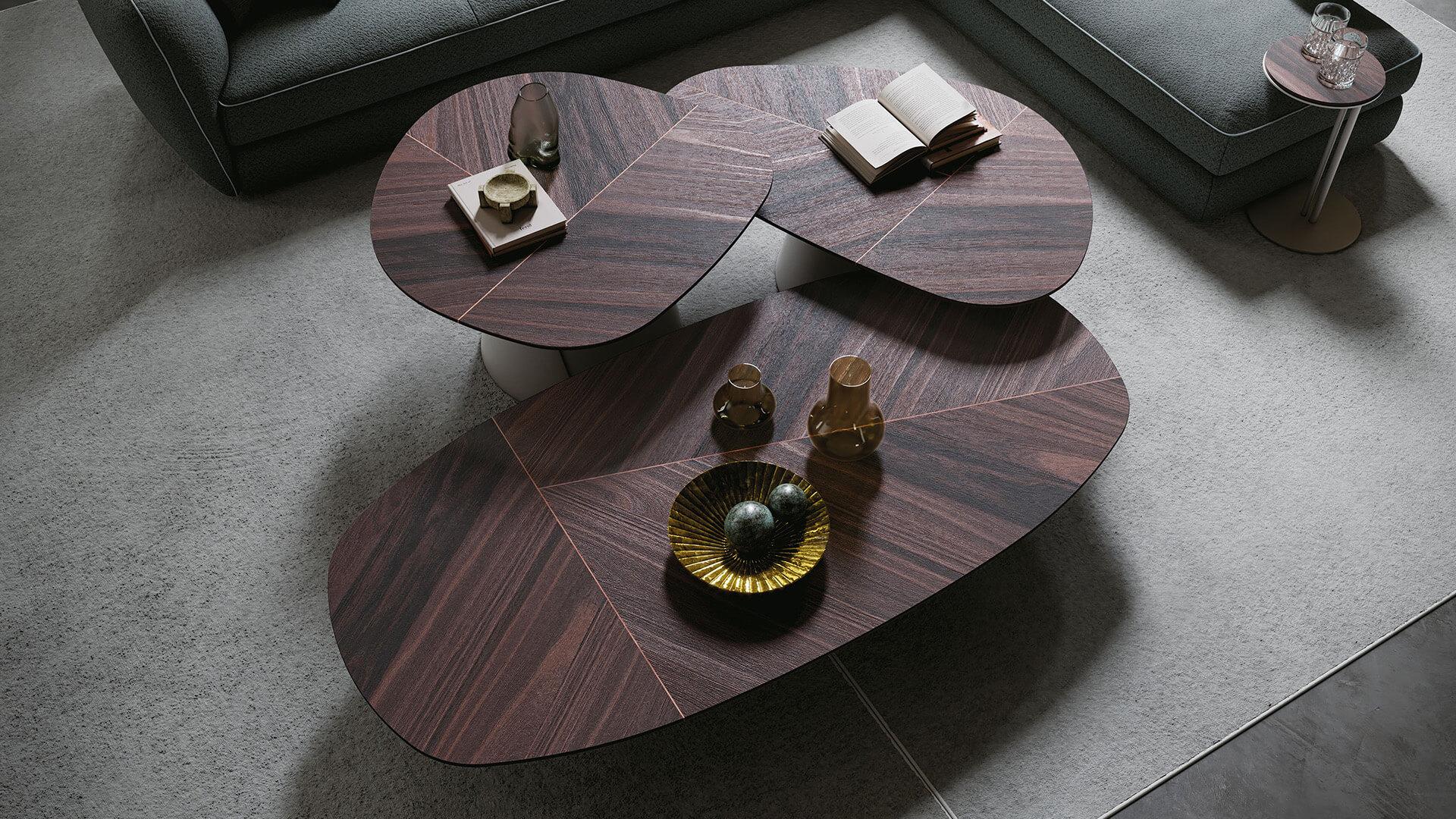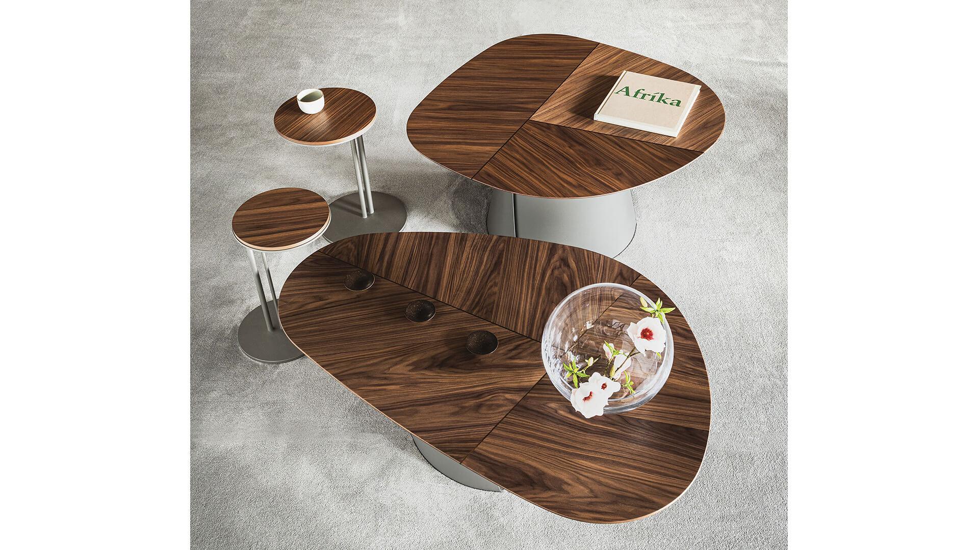 Столики выполнены с одинаковыми основаниями и столешницами мягкой, слегка неправильной геометрической формы. Своего максимального эстетического звучания они достигают в композициях разной высоты и размера. Игра многоуровневых поверхностей добавляет пространству динамики и движения, оставаясь при этом в рамках сдержанной элегантности — именно такие интерьеры становятся идеальным фоном для этих современных деревянных столиков.