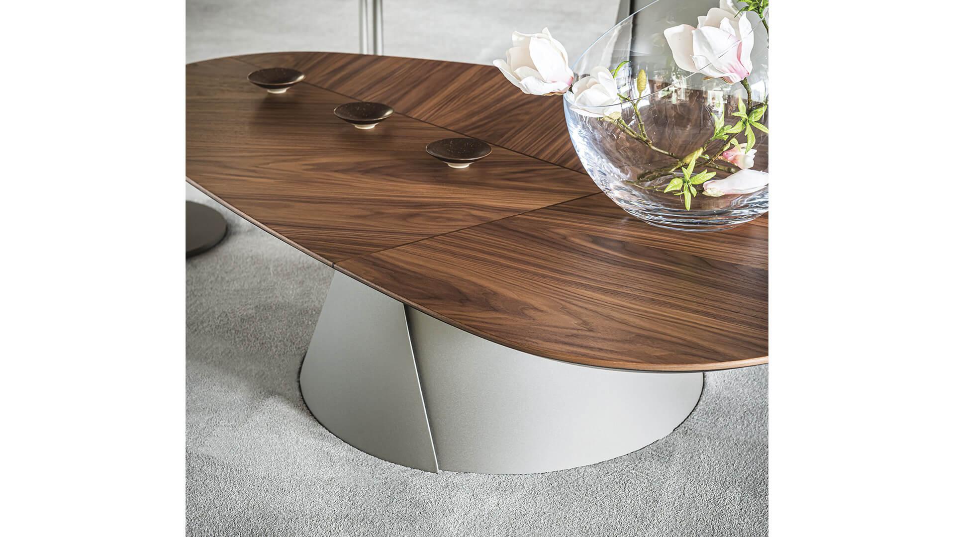Коническое металлическое основание пропорционально размеру столешницы. Оно изготовлено из двух свёрнутых и частично наложенных стальных листов, а его стройный силуэт формируется двумя диагональными срезами на поверхности металла.