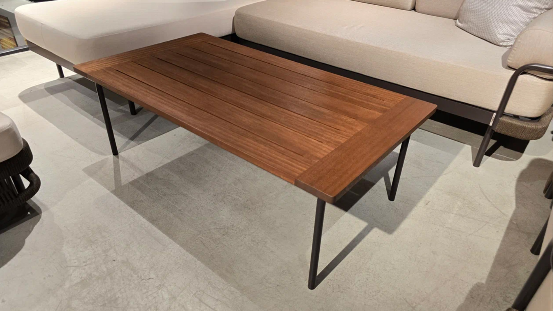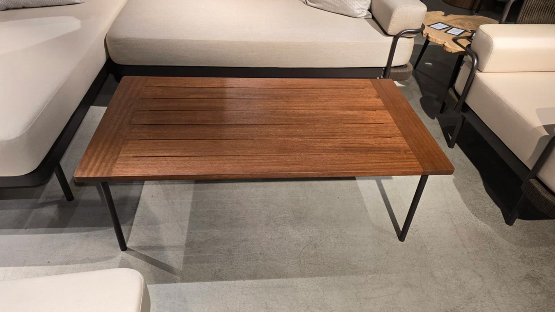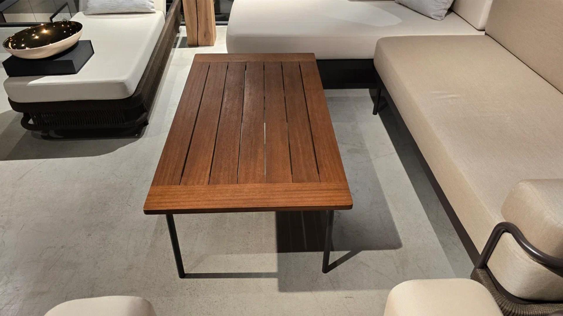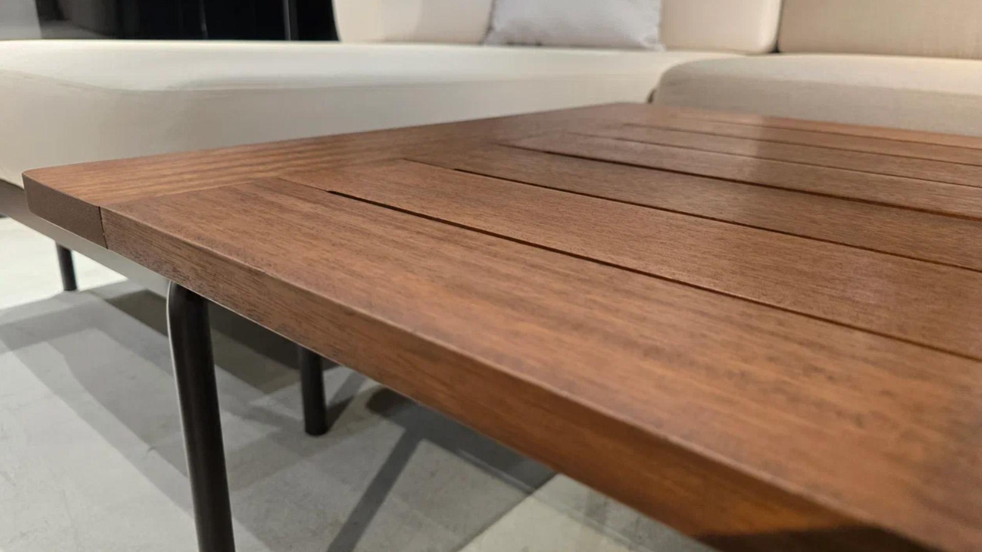 Каркас стола - алюминий в порошковой покраске, а столешница - из массива дерева, которое обладает высокой износостойкостью и эстетичной фактурой.