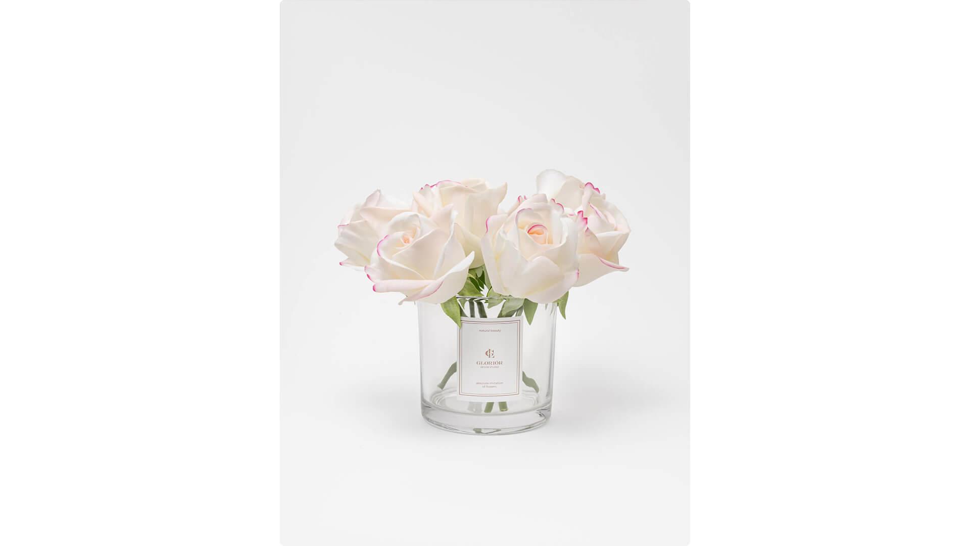 Элегантная мини-композиция с белыми розами из премиального эко-силикона станет красивым акцентом вашего интерьера. Нежные бутоны белого цвета придают интерьеру изысканность и лёгкость. Композиции GLORIOR – это полная имитация живых цветов, которая выглядит натурально и прослужит вам долгие годы.